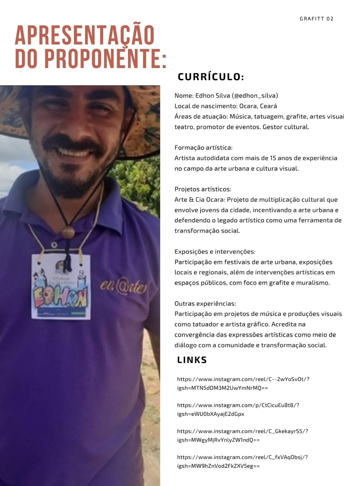 AUTO DIDATA, INICIA EM CASA E NA ESCOLA AS PRIMEIRAS OPORTUNIDADES ARTÍSTICAS COM DESENHO, PINTURA E MÚSICA. POR VOLTA DE 2000 EM FORTALEZA E REGIÕES, TRABALHO MUSICAL EM BANDAS DE SAMBA, ROCK, POP, FORRÓ, AXÉ, CAPOEIRA COMO INSTRUMENTISTA, TENDO CONTATO COM VÁRIOS INSTRUMENTOS. NO MESMO PERÍODO MOVIMENTOS DE RAP E HIP HOP.