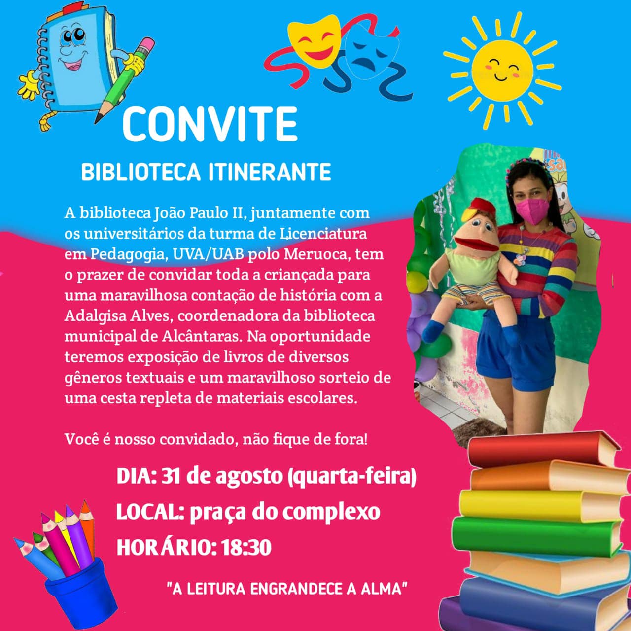 A BIBLIOTECA JOÃO PAULO II FOI FUNDADA EM 1999, COM O OBJETIVO DE PROMOVER A LEITURA E PROMOVER ATIVIDADES DE FRUIÇÃO DA LEITURA. O ESPAÇO É PÚBLICO E ATENDE CERCA DE 150 PESSOAS POR MÊS, PROMOVE AÇÕES ITINERANTES DURANTE O ANO E ATENDIMENTO NO ESPAÇO FÍSICO DE SEGUNDA A SEXTA DAS 08 ÁS 17 HRS.Critérios de uso do espaço