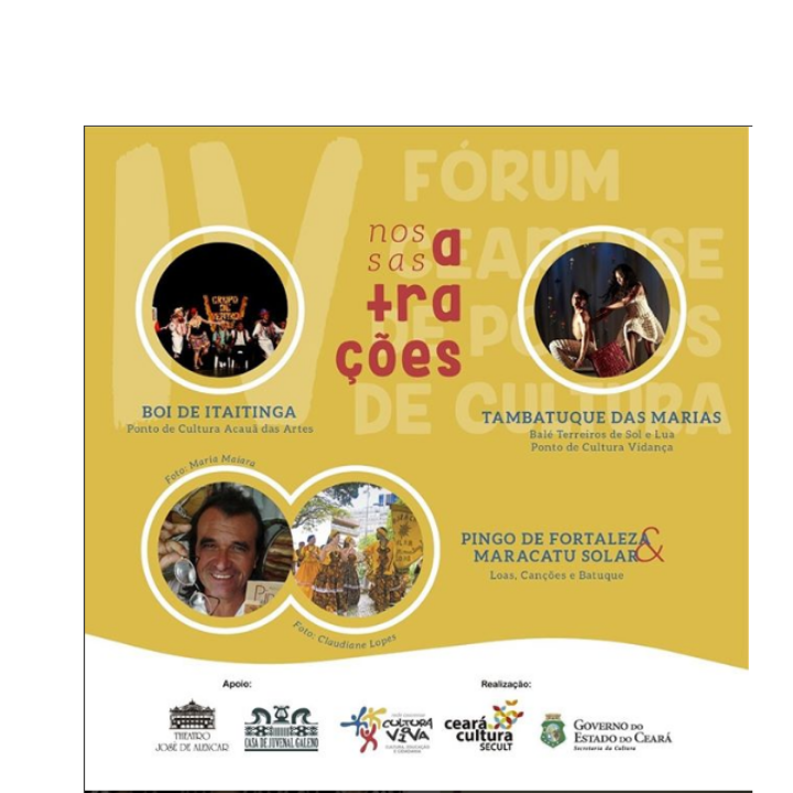 O espetáculo “Terreiros de Sol e Lua”, o “Tambatuque DasMarias” - contemplado pelo Criança Esperança em parceria com a Unesco e o Cultura Infância - e o “Tambatuque do Vidança” foram uma das atrações do 4º Fórum Cearense dos Pontos de Cultura. O fórum ocorreu nos dias 24,25 e 26 de Maio, no Theatro José de Alencar. O encontro foi uma parceria da Rede Cearense dos Pontos de Cultura e da Secretaria da Cultura do Estado do Ceará (Secult/Ce).