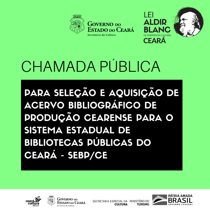 O objeto da presente chamada trata da seleção e aquisição de acervo bibliográfico de produção cearense, literários e técnico-acadêmicos, sendo vedada aos livros didáticos, que contemple diversidade de gêneros textuais, múltiplos olhares, linguagens e narrativas com relevância contemporânea para o Ceará, para o Brasil e para o mundo, considerando diferentes público (infância, juvenil e adulto), também os princípios orientadores do plano de trabalho para o uso dos recursos da Lei nº 14.017/2020, a Lei Aldir Blanc, desenvolvido pela SECULT-CE, obedecendo, ainda, às premissas do Plano Estadual de Cultura, instituído pela Lei n° 16.026/2016.